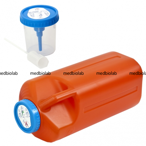 Гигиеничные контейнеры для сбора (120 мл – разовая порция / 3 л – суточный анализ) с герметичными крышками.